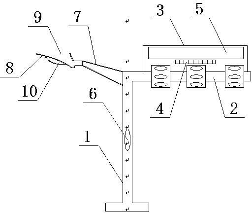 赢咖7极悦主要要求: 1.一种组合式信号灯,包括灯杆(1)以及安装在灯杆(1)上的横梁(2),所述横梁(2)上安装有红、黄、绿三种颜色的信号灯,其特征在于:所述横梁(2)的上端安装有支撑板(3),所述支撑板(3)上安装有计数器(4),在计数器(4)的上方设有液晶显示屏(5),所述灯杆(1)上设有呼叫按钮(6);所述灯杆(1)的顶端通过斜杆(7)安装有LED灯(8),所述LED灯(8)上方设有灯罩(9)和位于灯罩(9)下方的散光板(10)。