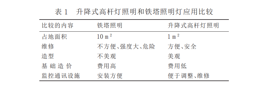 早期建造的固定式高杆灯, 灯盘固定于灯杆顶部, 维修工作需搭建钢架或利用升降式高架车。为了解决固定式高杆灯的维修问题, 我国第一基升降式高杆灯于 80 年代后期研制成功, 填补了我国在这一领域的空白, 也为日后升降式高杆灯在我国的发展奠定了基础。