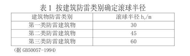 所谓“滚球法” (roll-ball method),就是选择一个半径为 h r (滚球半径)的球体,沿需要防护直击雷的部位滚动,如果球体只接触到避雷针(线)或避雷针(线)与地面,而不触及需要保护的部位,则该部位就在避雷针(线)的保护范围之内。滚球半径 h r 按建筑物的防雷类别而取不同值。