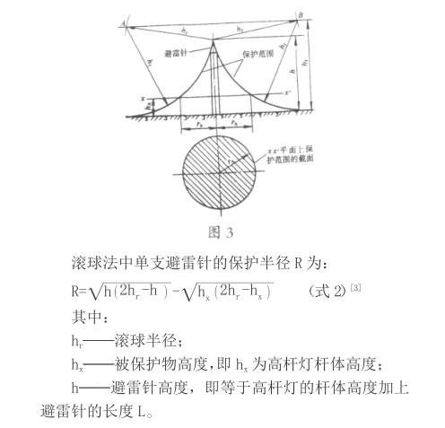 摘 要 :采用折线法和滚球法对两型机场站坪高杆灯的避雷针进行防雷分析,找出部分现有高杆灯避雷针防雷存在的不足之处,并以 IEC 推荐的“滚球法”为依据,对两型高杆灯避雷针的保护半径进行计算分析,回溯分析所需的避雷针长度,并提出了相关的改进建议。