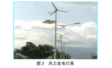 1.2 风力发电 风能,在照明上的应用已经是很成熟的技术,1kW~10kW 的风力发电照明独立设备已经成型生产(见图 2)。但叶片要求旋转空间较大,特别是功率大于 3 KW 时叶片长度大约在 3 m 左右,且180°范围均为避让区域,对码头作业的限制条件过多,且一次投资成本较高。所以,在码头堆场照明中,不建议采用风能技术,但同样路灯等中杆型照明可推荐使用,有一定的节能空间。