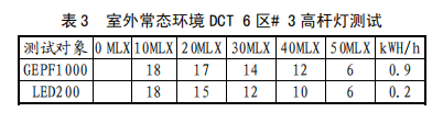 DCT 6 区# 3 号高杆灯测试情况见表 3。