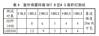 对比试验结论:在 30 m 高度照度对比是 LED视宽略小,照度与 GE 基本相同。考虑照度与节电情况综合比对, LED 综合优点明显。 30 m 对比试验:雨雾环境,室外 DCT 6 区# 3号高杆灯测试见表 4。