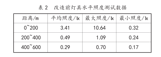 0~200m 垂直照度:从灯杆最低位置逐渐提升,平均达到 7.37lx,最大达到 16.6lx。照度在 200m 临界值降低至 2~3lx,并且存在照度不均匀的特点。200~400 m 垂直照度:在这一范围内继续衰减,最小照度仅有 0.68 lx。400~600 m 垂直照度:在这一范围内继续衰减并且基本在道路中间位置达到最小照度值,最小照度仅为 0.17 lx。2.3 测试照度分析根据实测数据分析可以看出:现有照明的水平照度平均值较低,低于国家标准《室外作业场地照明设计标准》(GB 50582—2010) 对港区次要道路地面水平照度平均值应大于 10 lx的要求,不能满足夜间正常安全生产的需要;局部照度变化过大,存在光斑现象,容易造成人眼的视觉不适,不利于现场人员的安全操作。虽然垂直照度测试平均值略高于水平照度,但是从 200 m 到道路中间位置基本所有测试点照度都在 2 lx以下,不能满足正常安全作业照明的需要。
