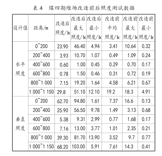 赢咖7极悦按照国家标准《室外作业场地照明设计标准》(GB 50582—2010)港区次要道路地面水平照度平均值应大于 10 lx 的要求, 对堆场照明进行改造,经过一段时间的使用,取得了不错的效果。现将改造前后堆场照度进行比较,见表 4。