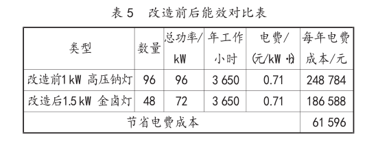 赢咖7极悦4 改造前后能量消耗对比改造前堆场照明共需要 96 盏高压钠灯,改造后仅需 48 盏金卤灯。按堆场照明平均每天工作 10h,每年工作 365d,电费 0.71 元 /kW·h 计算,改造前成本为 248784 元 /a,改造后成本为 186588 元 /a。共节约成本 61596 元 /a,见表 5。