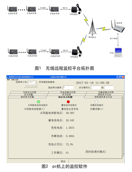 赢咖7极悦系统的常规控制功能外,还具备对路灯系统的基本运行数据的采集、存储和数据传输功能。同时,该路灯控制器还具备基于ZIGBEE通信方式的数据互传及路由组网功能,最终通过GPRS通信通道实现与远端PC机监控软件的互访。图1为无线远程监控平台拓扑图。图2为PC机上的监控软件,通过监控软件即可与远端的所有太阳能路灯实现互访和人机互动。