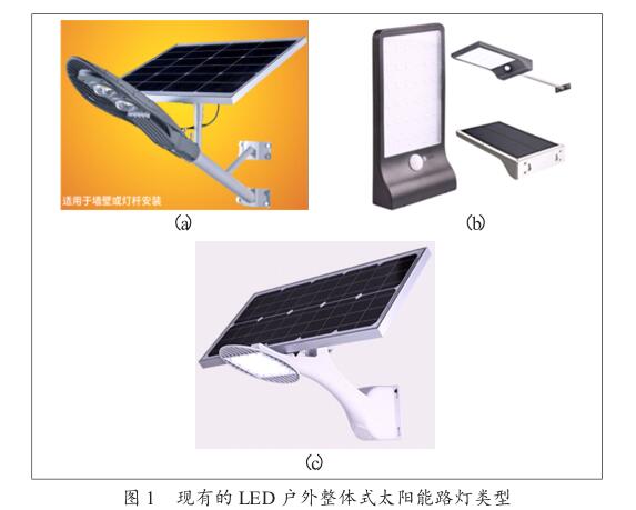 一体化太阳能路灯全体感强、简练、漂亮,便于运送及装置。在白日,其既可让太阳能板作为锂电池充电,也能够作为景观装修;光线暗下来后操控器经过预设时段及太阳能板的电压检测,自动判别为全体式太阳能路灯的 LED灯供电,实现路途照明。市场上现有的LED野外全体式太阳能路灯首要有以下几种类型:图1(a)、图1(b)所示的一体化太阳能路灯,能够调整太阳能板的东、西、南、北朝向,使太阳能板的转化效率得到最大提升,但太阳能灯板装置在灯杆延伸支杆或灯体的延伸部位,使得单灯体积增大,不利于灯具的仓储及运送,无形中增加了太阳能灯具的附加本钱。图 1(c)所示为太阳能板与灯壳做成全体式,外观尽管简练、漂亮,但不利于灯珠的散热,其限制了灯具的功率且不能调整太阳能板的朝向,使太阳能板不能高效地将太阳能转化为电能。