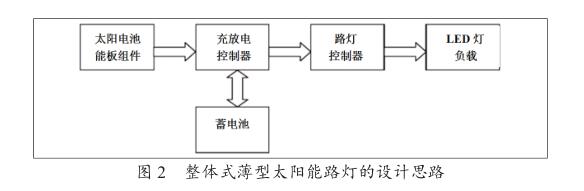 全体式薄型太阳能路灯的规划思路同一般的太阳能照明基本原理相同(如图2所示)。全体式薄型太阳能路灯,白日通过太阳能板组件将收集的太阳光的能量转化为电能,经过充放电操控器给蓄电池充电,以及各种电池检测及安全防护,在晚上或光线较暗时由蓄电池经路灯操控器为LED灯供给电能,点亮LED路灯用于照明。