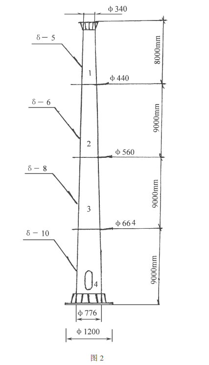 图 1 整体灯杆为圆台形、分四节 ,分别长为 8、 9、 9、 9m。成型后的灯杆 ,杆梢外径 O340mm,杆根外径 O776mm,整杆斜率 tgT= 0. 00623,符合高层建筑、筒 体结构的整体斜率的规范 ,暂设壁厚分别为 5、6、8、10mm。灯杆杆根处环形底板的厚度为35~ 40mm,其内 空圆直径 O640mm,外圆直径 O1 200mm,圆环平面上 均等地分布 16个 O48mm的地脚螺栓孔 ,其孔中心的 分布圆直径为 O1 000mm。 成型后的灯盘、杆体示意图分别见图 1、图 2。