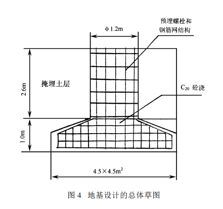 图 4 地基设计的总体草图 高杆灯的重力 EG= 56. 36kN,风荷载总弯矩 M4= 555. 66kNm
