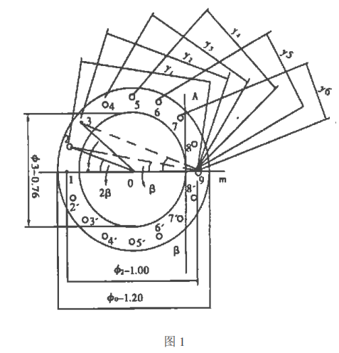 图1中: 16个螺栓均匀分布,相邻的2个螺栓中心成对的中心角为2β。 2β=360°/16=22°30 ',且2 =1 .00 m 3 =0 .76 m,y0 =2=1. 00 m y2 =1. 00×cos 22°30 ' =0. 9239 m; y3=1.00×cos38°45'=0.7853m; y4 =1 .00 ×cos45°=0 .7070 m;
