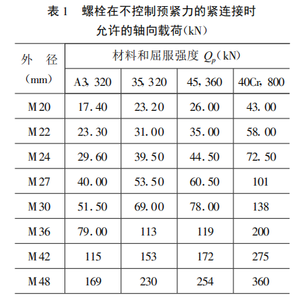 ∑M2 = ∑M1时,Nmax =∑M1 ∑y; 另外σy = y0 +2( y1 + y2 +…+ y6 ) = 1.00 +2( 0.9812 + 0.9239 + 0.7853 + 0.7 )max =630 .6 kNm 9 .8120 m =64 .27 kN,即螺栓可能受到的最大轴向拉伸力64 .27 kN。 3埋入螺栓的选定高杆灯埋入螺栓的选定需要考虑螺栓的有效截面积、螺栓的钢材形式、螺栓的作用力。 所选地脚螺栓的外径尺寸和制作的钢材型号如表1所示。 根据表1,该高杆灯应该选择的地脚螺栓是M30外径,钢材的型号可以选择35,320型或者45,360型即可。 ( Qp >N max )
